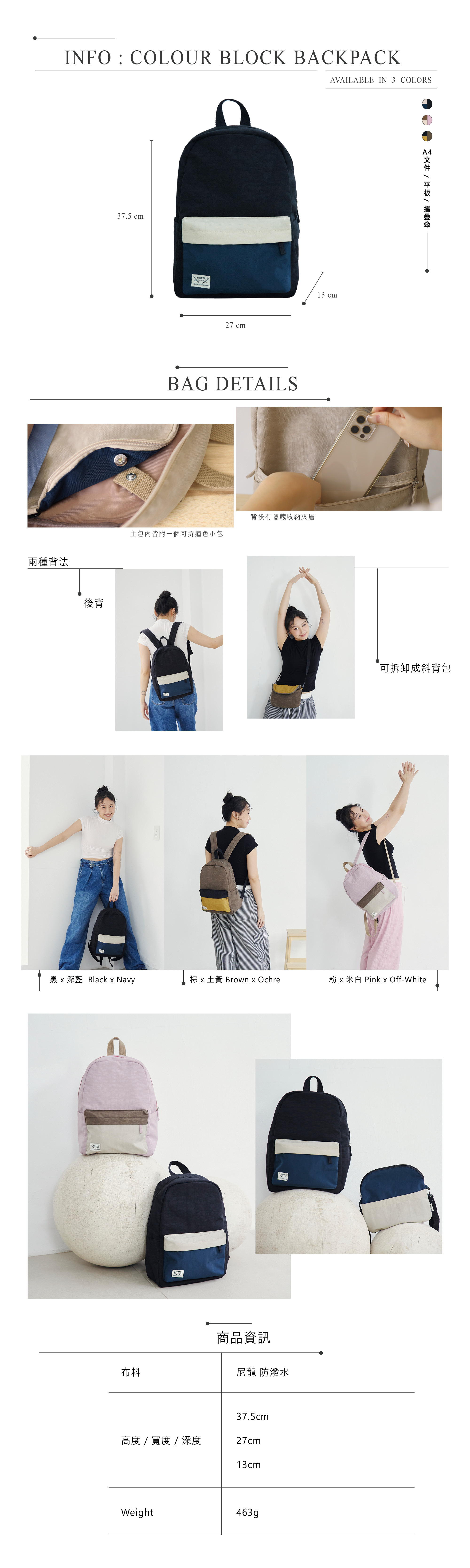 Our Color-Block Convertible Backpack is designed with the spirit of “Travel in one go.”